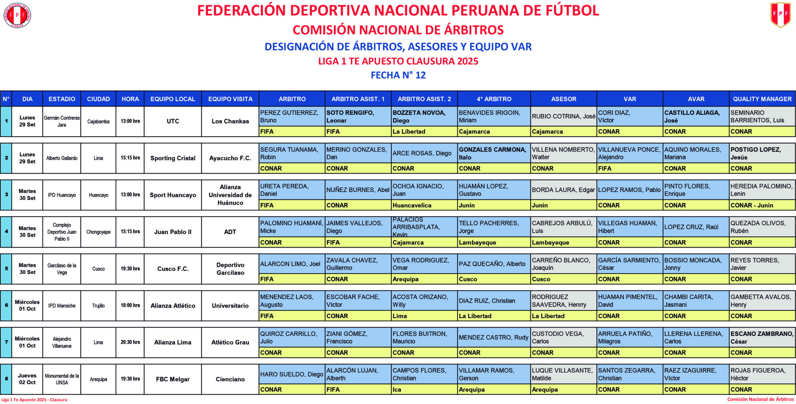 La Comisión Nacional de Árbitros publicó la programación de árbitros y árbitros VARs para la fecha 12 del Torneo Clausura de la Liga1 Te Apuesto 2025.