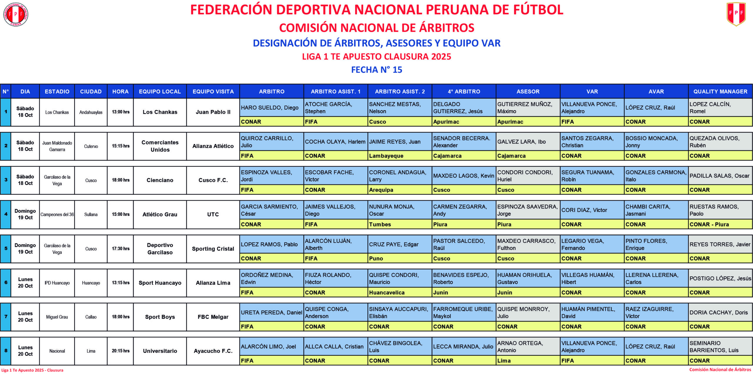 La Comisión Nacional de Árbitros publicó la programación de árbitros y árbitros VARs para la fecha 15 del Torneo Clausura de la Liga1 Te Apuesto 2025.